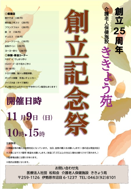 下記の日時に、ききょう苑創立25周年 創立記念祭を実施する予定です。
